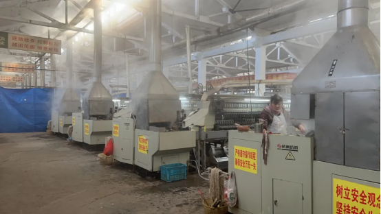 在海安蘇豪,繅絲車間內(nèi)機(jī)器轟鳴,熱氣騰騰,工人們?nèi)褙炞⒌剡M(jìn)行繅絲標(biāo)準(zhǔn)化作業(yè)。一縷縷潔白細(xì)膩的絲線從蠶繭中緩緩抽出,經(jīng)過精細(xì)加工,化作高質(zhì)量的繭絲原料,為后續(xù)的生產(chǎn)環(huán)節(jié)奠定堅實(shí)基礎(chǔ)。車間內(nèi),大家干勁十足,對新的一年充滿期待。