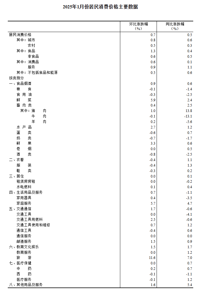 2025年1月份,全國(guó)居民消費(fèi)價(jià)格同比上漲0.5%。其中,城市上漲0.6%,農(nóng)村上漲0.3%;食品價(jià)格上漲0.4%,非食品價(jià)格上漲0.5%;消費(fèi)品價(jià)格上漲0.1%,服務(wù)價(jià)格上漲1.1%。