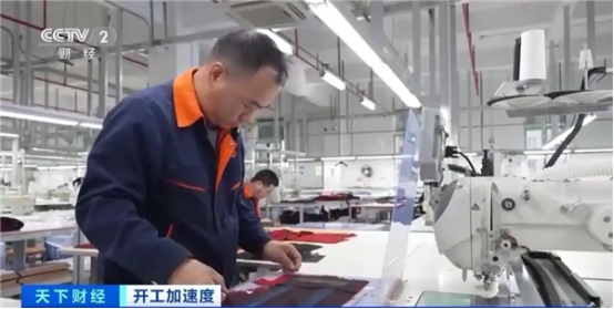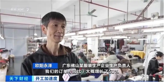 廣東佛山某服裝生產(chǎn)企業(yè)生產(chǎn)負(fù)責(zé)人 歐陽(yáng)永澤:我們開工提前了一周。今年一月份到現(xiàn)在,我們的訂單同比大概增長(zhǎng)了50%?,F(xiàn)在我們工人缺口還是蠻大的。