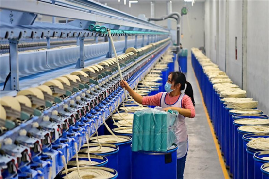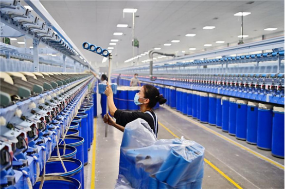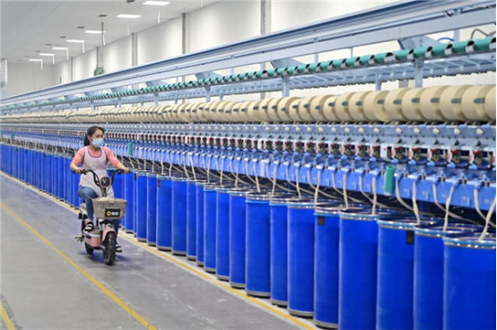 近日,江西省宜春市上高縣工業(yè)園區(qū)的一家民營紡織企業(yè)車間內,工人在智能紡紗生產線上加工出口訂單產品。
