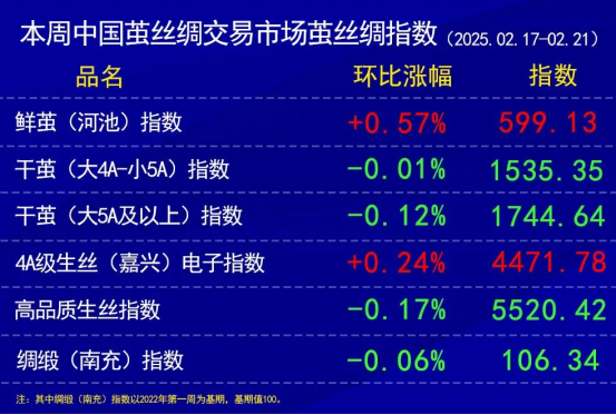 今日(2025年02月21日,周五)中國繭絲綢交易市場生絲電子指數(shù)微跌0.07%報收于4471.78點,本周生絲指數(shù)累計上漲0.24%。B絲2022D(商檢4A級生絲):250325合約報平收于45.06萬元;250925合約上漲0.03萬元報收于44.85萬元;260325合約下跌0.03萬元報收于44.88萬元。