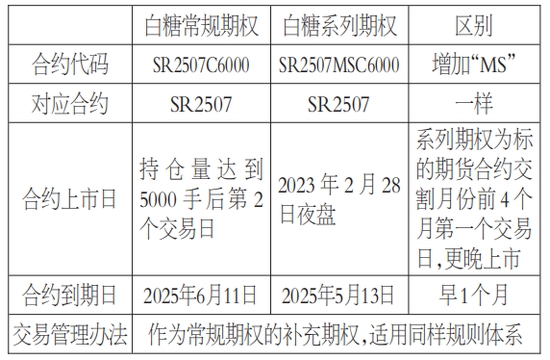 系列期權(Serial Options)或短期期權,是在現(xiàn)有常規(guī)期權合約基礎上增掛的新合約,與常規(guī)期權都基于同一標的期貨合約。系列期權在合約交易代碼中注明系列期權標識MS,如以SR2507為標的的常規(guī)期權合約代碼為SR2507C6000,而系列期權的合約代碼為SR2507MSC6000,與常規(guī)期權“插空”共存。