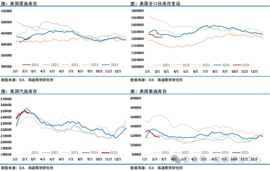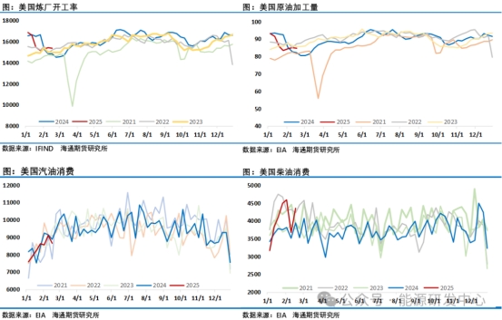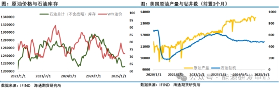 另外周五美國總統(tǒng)特朗普政府正在向伊拉克施壓要求其增加出口,這是周五夜盤油價(jià)暴跌的直接原因。特朗普要求其允許庫爾德石油出口重啟,否則將與伊朗一起面臨制裁。庫爾德地區(qū)恢復(fù)石油出口,將有助于抵消伊朗石油出口可能下降的影響。作為特朗普對(duì)伊朗施加“最大壓力”行動(dòng)的一部分,美國已承諾將伊朗石油出口降至零。美國政府曾表示,希望將伊朗從全球經(jīng)濟(jì)中孤立出來,并消除其石油出口收入,以減緩伊朗發(fā)展核武器的速度。從相關(guān)數(shù)據(jù)可以看出過去一段時(shí)間伊朗原油出口已經(jīng)開始回落,從22年歐佩克+開啟減產(chǎn)以來,伊拉克原油產(chǎn)量從最高點(diǎn)回落了約50萬桶/日,其中去年7月以來下降了30萬桶日,而出口量從22年底的高點(diǎn)回落了60萬桶/日。美國這樣的決定可能會(huì)影響歐佩克+減產(chǎn)執(zhí)行效果,給歐佩克+即將于4月的減產(chǎn)退出計(jì)劃帶來變數(shù)。美國前總統(tǒng)特朗普上任后呼吁OPEC+“降低油價(jià)”,OPEC+沒有改變其產(chǎn)量計(jì)劃,近期市場有消息傳出石油輸出國組織及其盟友(OPEC+)考慮推遲原定于2025年4月啟動(dòng)的月度增產(chǎn)計(jì)劃。綜合看來相關(guān)利益方的博弈將繼續(xù)給供應(yīng)端制造變數(shù),但整體變化導(dǎo)向可以看出,給油價(jià)上行的驅(qū)動(dòng)越來越弱,油價(jià)最終破位下行的概率越來越大。