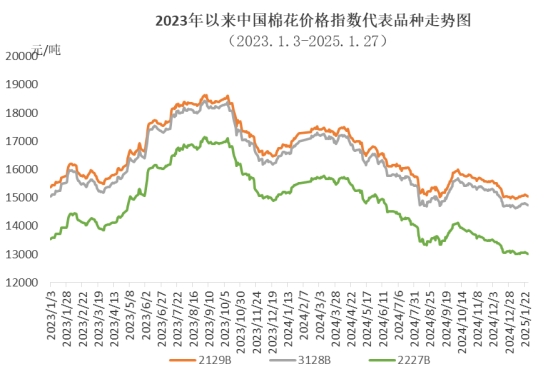 1月,新棉加工量持續(xù)增加,市場供應(yīng)寬松,月初國內(nèi)棉價(jià)延續(xù)前期下跌趨勢,中國棉花價(jià)格指數(shù)(CCIndex3128B)最低跌至14630元/噸。隨后,央行等部門釋放積極政策信號,提振市場情緒,棉價(jià)逐漸反彈至14814元/噸。月末,受春節(jié)假期影響,購銷市場基本停滯,棉價(jià)略有回落。1月中國棉花價(jià)格指數(shù)(CCIndex3128B)月均價(jià)14721元/噸,環(huán)比下跌228元,同比下跌1969元。