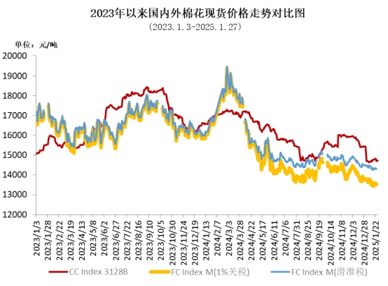 2025年1月,國內(nèi)棉花市場呈現(xiàn)先跌后漲的走勢。月初,新棉供應(yīng)持續(xù)增加,現(xiàn)貨價(jià)格小幅回落;中旬,隨著宏觀政策預(yù)期轉(zhuǎn)暖,棉紡織廠對后市持樂觀態(tài)度,適度補(bǔ)充原料庫存,推動(dòng)棉價(jià)上漲;下旬,受春節(jié)假期影響,紡織廠陸續(xù)放假,市場成交轉(zhuǎn)淡,棉價(jià)略有回落。同期,受美元指數(shù)沖高回落、USDA報(bào)告上調(diào)全球產(chǎn)量等因素影響,國際棉價(jià)震蕩下跌,內(nèi)外棉價(jià)差隨之波動(dòng)。