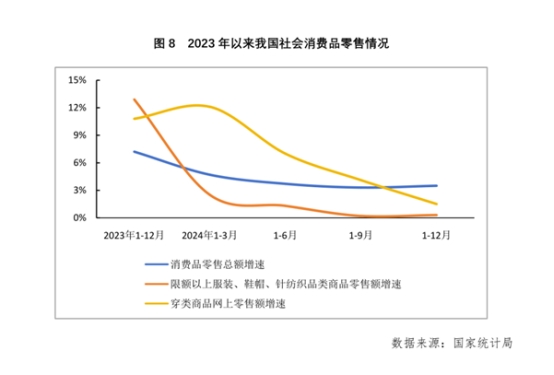 2024年我國紡織服裝商品內(nèi)需消費(fèi)實(shí)現(xiàn)溫和增長,但受到宏觀經(jīng)濟(jì)放緩影響,各項(xiàng)內(nèi)銷指標(biāo)增速均較上年有所放緩。國家統(tǒng)計(jì)局?jǐn)?shù)據(jù)顯示,2024年我國限額以上服裝、鞋帽、針紡織品類商品零售額為14691億元,同比增長0.3%,增速較上年回落12.6個(gè)百分點(diǎn);實(shí)物商品網(wǎng)上穿類商品零售額同比增速為1.5%,增速較上年回落9.3個(gè)百分點(diǎn)。