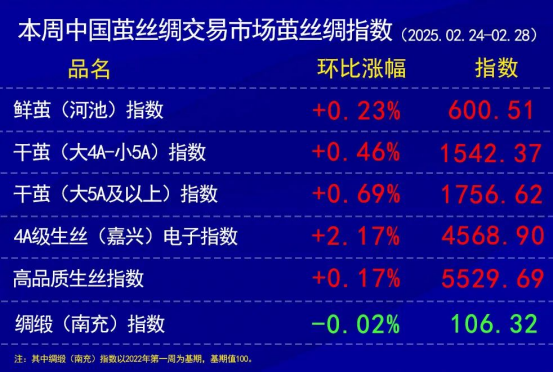 高品質(zhì)生絲指數(shù)上,根據(jù)協(xié)作單位所報(bào)情況來(lái)看,銷售情況整體好于上周。價(jià)格指數(shù)環(huán)比上周略好紅。