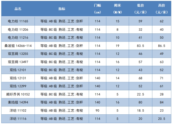 本周綢緞指數(shù)協(xié)作單位成交價(jià)格區(qū)間