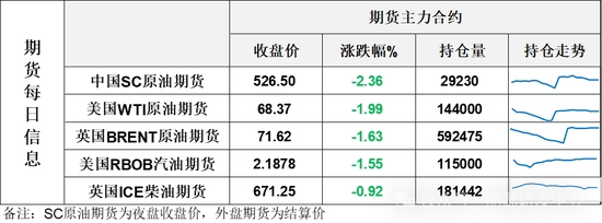 【1】WTI主力原油期貨收跌1.39美元,跌幅1.99%,報68.37美元/桶;布倫特主力原油期貨收跌1.19美元,跌幅1.63%,報71.62美元/桶;INE原油期貨收跌2.36%,報526.5元。