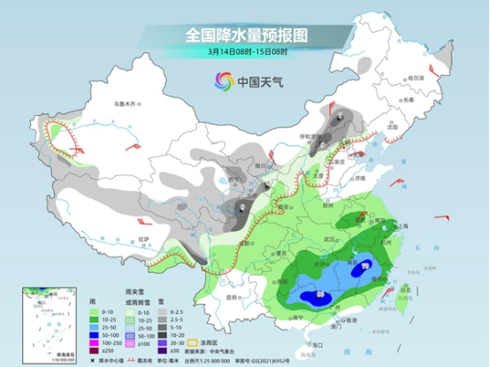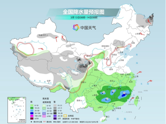 今起至周末,南方將有大范圍降雨天氣,江南、華南部分地區(qū)雨勢較強,或現(xiàn)暴雨,上述地區(qū)局地伴有短時強降水、雷暴大風(fēng)等強對流天氣。此外,今天黑龍江、內(nèi)蒙古東部多地仍有降雪,需警惕積雪和道路結(jié)冰對交通的不利影響。