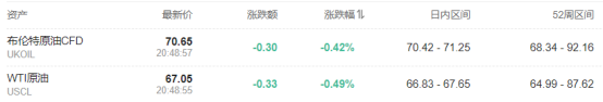 布油、美油日內(nèi)均跌超0.4%,分別報(bào)70.65美元/桶和67.05美元/桶。