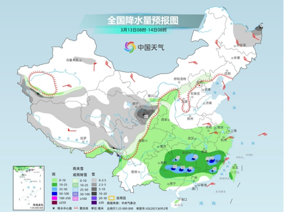 今后三天(3月13日至15日),南方大范圍降雨持續(xù),雨勢(shì)有所增強(qiáng),江南、華南部分地區(qū)需警惕強(qiáng)對(duì)流天氣,同時(shí)北方雨雪天氣也將逐漸鋪展。隨著新一股冷空氣的到來(lái),中東部大部地區(qū)將迎來(lái)明顯降溫,各地會(huì)陸續(xù)重返偏冷的氣溫格局。