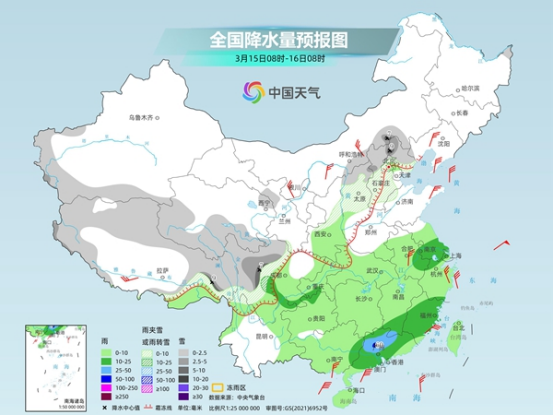 后天,內(nèi)蒙古東部、華北中北部、陜西中部、青海南部、西藏北部和東部、川西高原中北部、新疆南疆西部山區(qū)等地部分地區(qū)有小到中雪或雨夾雪,其中,內(nèi)蒙古東南部、河北北部、川西高原北部等地局部有大雪。安徽東南部、江蘇南部、浙江北部、福建大部、江西南部、廣東大部、廣西東部等地部分地區(qū)有中到大雨,其中,廣東西北部局部有暴雨。
