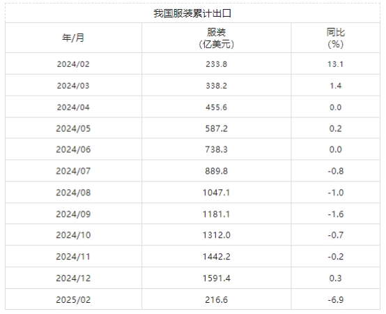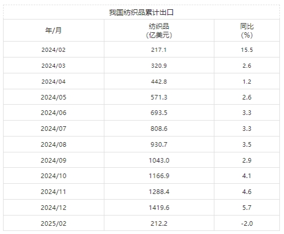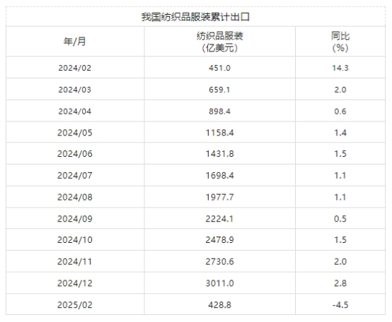2月我國(guó)紡織品服裝出口累計(jì)同比下降4.5%