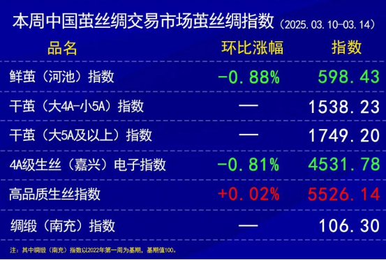 今日(2025年03月14日,周五)中國繭絲綢交易市場生絲電子指數(shù)下跌0.20%報收于4531.78點(diǎn),本周生絲指數(shù)下跌0.81%。B絲2022D(商檢4A級生絲):250325合約下跌0.15萬元報收于45.30萬元;250925合約下跌0.03萬元報收于45.33萬元;260325合約下跌0.03萬元報收于45.24萬元。