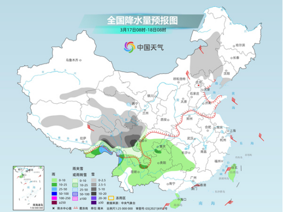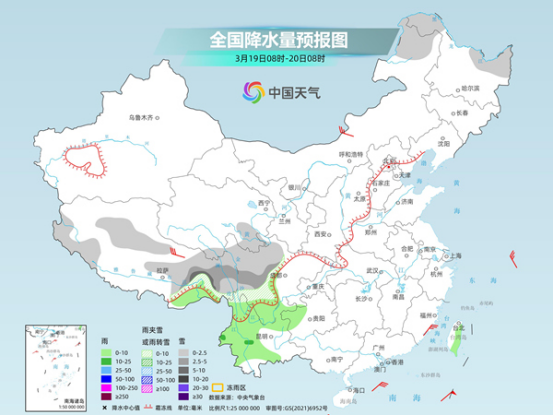 后天,內(nèi)蒙古東北部、西藏東部、川西高原等地部分地區(qū)有小到中雪或雨夾雪。西藏東南部、西南地區(qū)南部等地部分地區(qū)有小雨,局地有中雨。