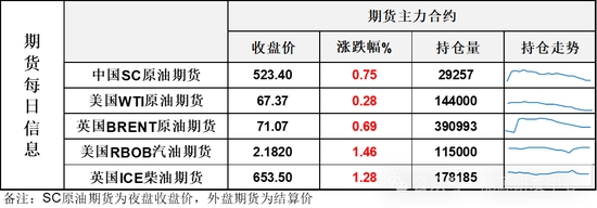 【1】WTI主力原油期貨收漲0.19美元,漲幅0.28%,報(bào)67.37美元/桶;布倫特主力原油期貨收漲0.49美元,漲幅0.69%,報(bào)71.07美元/桶;INE原油期貨收漲0.75%,報(bào)523.4元。