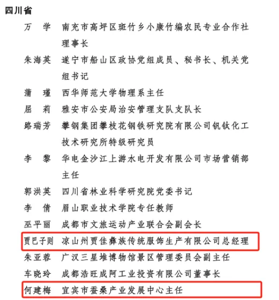 近日,全國婦聯(lián)在京舉行紀(jì)念“三八”國際婦女節(jié)暨表彰大會(huì)。大會(huì)表彰了10名全國三八紅旗手標(biāo)兵、596名全國三八紅旗手、395個(gè)全國三八紅旗集體、599個(gè)全國巾幗文明崗。其中,宜賓市蠶桑產(chǎn)業(yè)發(fā)展中心主任何建梅、涼山州賈佳彝族傳統(tǒng)服飾生產(chǎn)有限公司總經(jīng)理賈巴子則、四川紅旗絲綢有限公司繅絲工凌國青榮獲“2024年度全國三八紅旗手”稱號(hào)。
