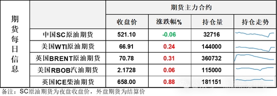 【1】WTI主力原油期貨收漲0.16美元,漲幅0.24%,報(bào)66.91美元/桶;布倫特主力原油期貨收漲0.22美元,漲幅0.31%,報(bào)70.78美元/桶;INE原油期貨收跌0.06%,報(bào)521.1元。