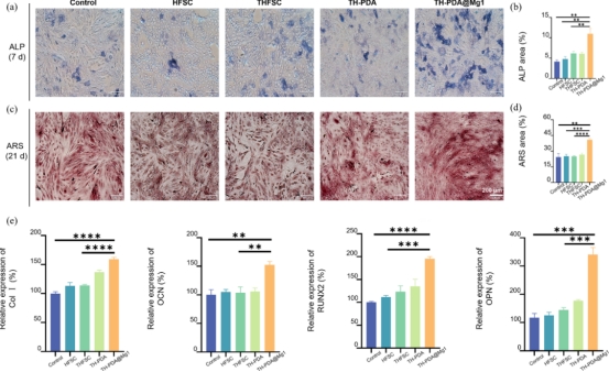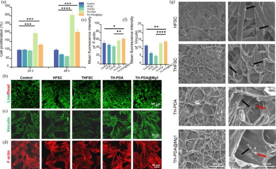 細(xì)胞毒性試驗(yàn)(圖a)表明,引入PDA后具有提升的細(xì)胞活力,適量加入Mg2+對于細(xì)胞活性也有提升。使用TH-PDA@Mg1作為支架組別,該組別活死染色(圖b-f)展現(xiàn)出良好的生物相容性和最小的細(xì)胞毒性。從細(xì)胞在支架上的粘附情況(圖g)可以看出,TH-PDA和TH-PDA@Mg1支架明顯促進(jìn)成骨細(xì)胞的粘附,表面細(xì)胞呈拉長和分散的狀態(tài),具有絲狀偽足和片狀偽足的延伸。這可能與支架表面結(jié)構(gòu)變化及增強(qiáng)的細(xì)胞-物質(zhì)相互作用有關(guān)。