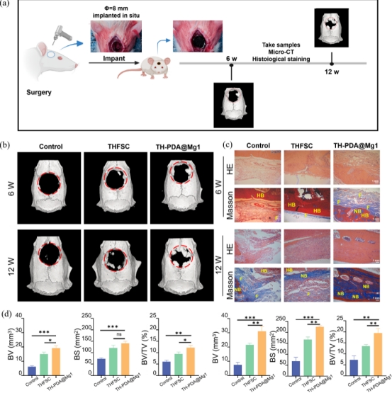該研究團(tuán)隊(duì)通過將FSC與PDA和Mg2+集成用于骨缺損修復(fù),開發(fā)了一種具有良好生物相容性的多功能復(fù)合支架。該方案簡化了絲素蛋白材料制備流程并降低成本,PDA和Mg2+的摻入顯著增強(qiáng)了MC3T3-E1細(xì)胞的增殖、遷移和成骨分化。TH-PDA@Mg1支架還促進(jìn)了巨噬細(xì)胞從M1促炎表型向M2促重構(gòu)表型的轉(zhuǎn)化,在顱骨缺損模型中表現(xiàn)出優(yōu)越的骨修復(fù)效果。具有促進(jìn)成骨細(xì)胞增殖和分化、巨噬細(xì)胞極化和體內(nèi)血管化等優(yōu)點(diǎn),表明材料在一系列的骨科應(yīng)用中具有巨大的潛力,除應(yīng)對不同大小的骨缺損以外,還可用于治療炎癥性骨病或促進(jìn)傷口愈合。未來將這種支架與藥物傳遞系統(tǒng)或生長因子結(jié)合,可以實(shí)現(xiàn)靶向治療,并進(jìn)一步提高其再生潛力。目前的研究證明了基于FSC的支架的成骨和免疫調(diào)節(jié)潛力,未來的工作應(yīng)集中于改進(jìn)FSC支架制造工藝,同時優(yōu)化其制備方法,闡明其作用機(jī)制,并探索高價值利用和大規(guī)模采用的多功能應(yīng)用。