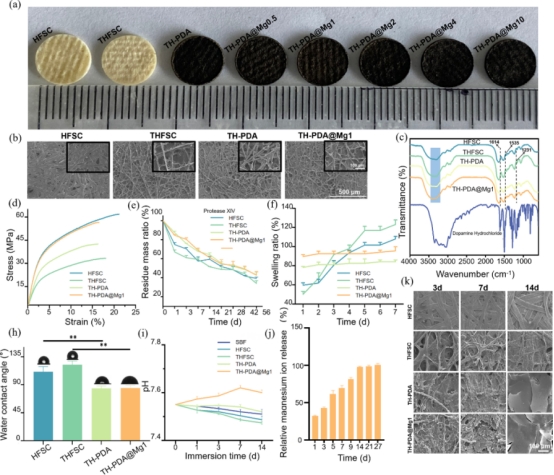 使用三元溶液處理熱壓過的平板絲(FSC)表面,得到THFSC,再室溫浸泡于含不同濃度硫酸鎂的多巴胺溶液中24h,得到各組含鎂樣品,改性后的支架由白色變?yōu)樯钭厣▓Da)。從應(yīng)力-應(yīng)變曲線(圖d)可以看出,Mg2+加載后,支架力學(xué)性能得到提升。同時,支架的降解速率得到減緩,溶脹率提高,表明PDA的存在增強(qiáng)了支架的親水性和結(jié)構(gòu)穩(wěn)定性(圖e、圖f、圖h)。模擬體液SBF的生物礦化實(shí)驗(yàn)(圖k)中,在TH-PDA和TH-PDA@Mg1組別的表面上觀察到明顯的磷灰石形成,表面修飾后促進(jìn)羥基磷灰石(HA)形成的能力增強(qiáng)。這種HA層的有效形成可能基于SBF中離子和PDA中的兒茶酚胺基團(tuán)之間存在強(qiáng)大的相互作用。
