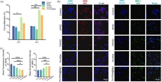 促進(jìn)巨噬細(xì)胞從M1向M2表型極化,可能是促進(jìn)骨缺損區(qū)骨形成的關(guān)鍵。除促進(jìn)RAW246.7細(xì)胞增殖(圖a)外,TH-PDA@Mg1組與M2相關(guān)的MRC-1染色強(qiáng)度最為顯著,與M1相關(guān)的iNOS較弱,證實(shí)了TH-PDA@Mg1能有效誘導(dǎo)巨噬細(xì)胞向M2表型極化。結(jié)合HFSC和THFSC組染色結(jié)果,表明SF、PDA 和鎂離子再加速巨噬細(xì)胞向M2表型轉(zhuǎn)化過程中發(fā)揮協(xié)同作用。