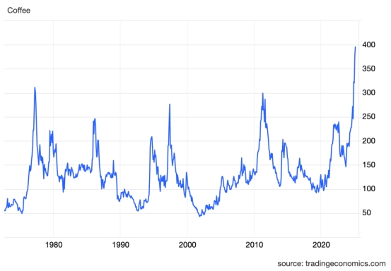 對(duì)于咖啡界最大的新聞,就是咖啡豆去年以來(lái)的明顯漲價(jià),主要是在主產(chǎn)國(guó)巴西減產(chǎn)等因素的影響下,咖啡期貨價(jià)格漲到了有史以來(lái)的最高位,我們從年前就開始關(guān)注。2月份創(chuàng)歷史新高后后有所回調(diào)。
