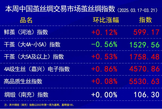今日(2025年03月21日,周五)中國繭絲綢交易市場生絲電子指數下跌0.20%報收于4570.86點,本周生絲指數上漲0.86%。B絲2022D(商檢4A級生絲):250325合約下跌0.27萬元報收于45.57萬元;250925合約下跌0.09萬元報收于45.78萬元;260325合約上漲0.03萬元報收于45.75萬元。
