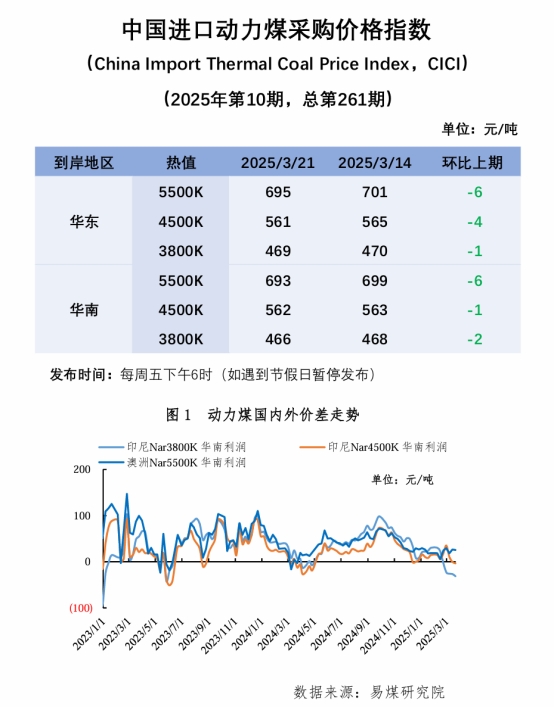 3月21日,5500K華東和華南進口動力煤(0, -641.00, -100.00%)采購價分別為695/噸和693元/噸,均較上期下跌6元/噸,較國內(nèi)煤價低15-25元/噸;4500K華東和華南進口動力煤采購價分別為561元/噸和562元/噸,分別較上期下跌4元/噸和1元/噸,較國內(nèi)煤價高0-10元/噸;3800K華東和華南進口動力煤采購價分別為469元/噸和466元/噸,分別較上期下跌1元/噸和2元/噸,較國內(nèi)煤價高30-40元/噸。(理論測算,僅供參考)