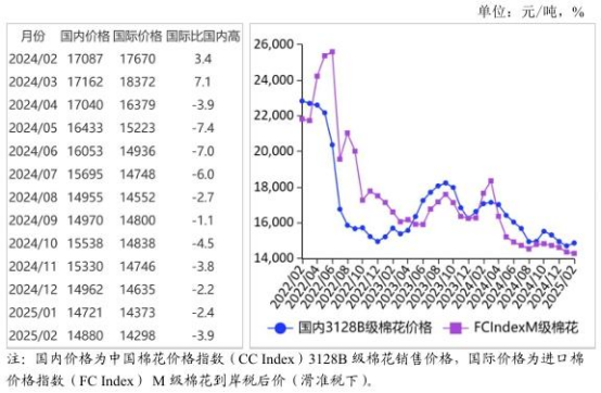 (二)國際棉價環(huán)比持平略跌。美國農(nóng)業(yè)部2月報告調(diào)增2024/2025年度全球棉花產(chǎn)量預(yù)期,國際市場棉花供應(yīng)充裕;特朗普政府月末再度威脅加征關(guān)稅,市場恐慌情緒增加,國際棉價持平略跌。2月份,CotlookA指數(shù)(相當(dāng)于國內(nèi)3128B級棉花)月均價每磅78.08美分,環(huán)比跌0.2%,同比跌21.0%。