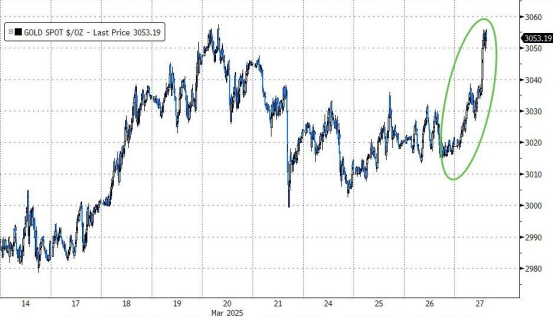 周四,美股早盤時,紐約期金盤中漲約1.6%至3100美元上方,創(chuàng)歷史新高?,F(xiàn)貨黃金也漲超1.26%,刷新歷史高位至3059.62美元。