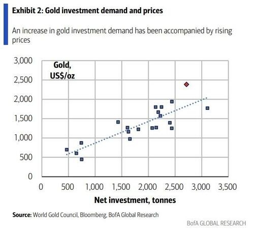 美銀的分析將黃金上漲與“投資需求的增量”掛鉤。美銀團隊表示,其黃金定價模型考慮了礦產、回收、飾品需求與投資需求等多個維度。