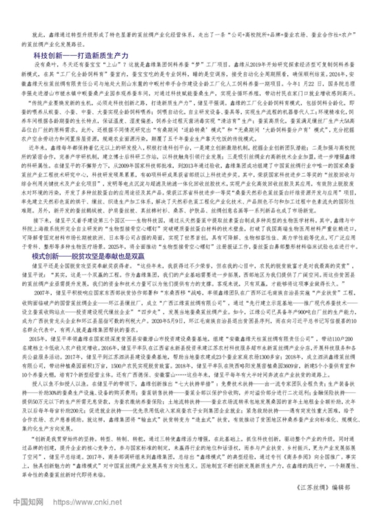 “創(chuàng)新是我貫穿始終的堅(jiān)持。轉(zhuǎn)型、轉(zhuǎn)制、轉(zhuǎn)舵,通過(guò)三轉(zhuǎn)使鑫緣活力增強(qiáng),在此基礎(chǔ)上,抓住科技創(chuàng)新,驅(qū)動(dòng)整個(gè)產(chǎn)業(yè)的升級(jí),同時(shí)通過(guò)品牌的創(chuàng)建,提升企業(yè)的核心競(jìng)爭(zhēng)力,參與國(guó)家標(biāo)準(zhǔn)的制定,來(lái)贏得行業(yè)的地位和話語(yǔ)權(quán),而參與產(chǎn)業(yè)扶貧、鄉(xiāng)村振興,更為產(chǎn)業(yè)發(fā)展拓展了空間”,儲(chǔ)呈平總結(jié)道。2017年,商務(wù)部調(diào)研組來(lái)到鑫緣集團(tuán),總結(jié)出“鑫緣模式”的典型經(jīng)驗(yàn),通過(guò)??渡虅?wù)參閱》向全國(guó)推廣。事實(shí)上,獨(dú)具創(chuàng)新魅力的“鑫緣模式”對(duì)中國(guó)繭絲綢產(chǎn)業(yè)發(fā)展具有方向性意義。因地制宜不斷創(chuàng)新發(fā)展新質(zhì)生產(chǎn)力,在鑫緣的踐行中,一個(gè)顛覆性、革命性的桑蠶繭絲新時(shí)代即將來(lái)臨。