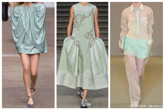 水玻璃色有著多樣的搭配可能。搭配銀色或白色,能進一步提升整體造型的通透感,給人清新脫俗的印象;與蜜桃軟糖色搭配,則能形成冷暖對比,碰撞出活潑又獨特的時尚“火花”。在材質(zhì)運用和剪裁設(shè)計上,水玻璃色同樣展現(xiàn)出多變的風(fēng)格:通過光澤感絲綢、珠光涂層面料,結(jié)合不對稱剪裁,能夠打造出極具未來感的廓型,彰顯設(shè)計師的先鋒時尚態(tài)度;當(dāng)它與啞光棉質(zhì)面料混搭時,又巧妙地弱化了科技冷感,讓整體風(fēng)格更顯日常優(yōu)雅,適合各種生活場景。