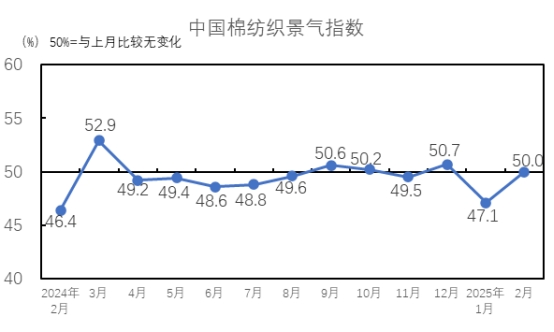 說明:中國棉紡織行業(yè)景氣指數(shù)采集自全國近500家次棉紡織企業(yè),參考國家制造業(yè)PMI等指數(shù)制定方式,通過對多個主要指標加權(quán)計算得出,當指數(shù)高于50,表示棉紡織行業(yè)本月景氣程度好于上月,低于50則表示本月景氣程度不及上月。
