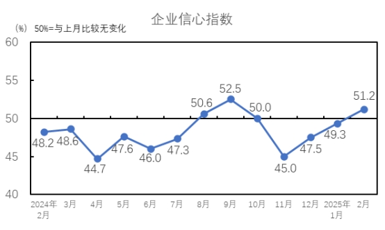 2025年2月,企業(yè)信心指數(shù)為51.2%,較1月上升1.9個百分點,企業(yè)信心指數(shù)高于臨界點,對未來市場的信心回升。2月份春節(jié)后企業(yè)復(fù)工復(fù)產(chǎn)順利,銷售好轉(zhuǎn),經(jīng)營情況有所改善,并且臨近傳統(tǒng)旺季,企業(yè)對未來市場的信心增強。