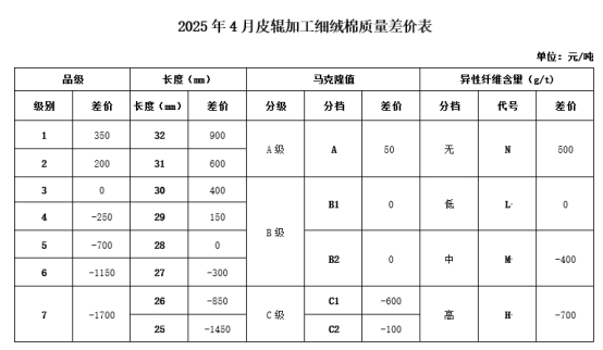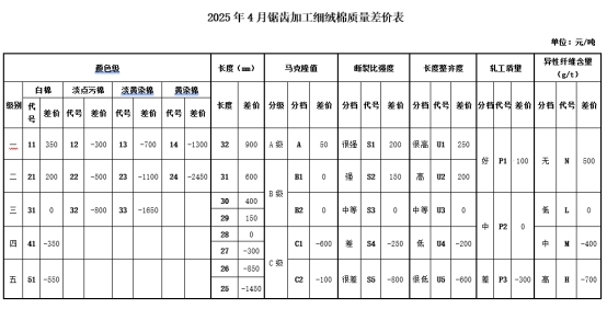 根據(jù)《中國棉花協(xié)會(huì)國產(chǎn)棉質(zhì)量差價(jià)表管理辦法》規(guī)定,現(xiàn)正式發(fā)布2025年4月《鋸齒加工細(xì)絨棉質(zhì)量差價(jià)表》、《皮輥加工細(xì)絨棉質(zhì)量差價(jià)表》和《長絨棉質(zhì)量差價(jià)表》(單位:元/噸)。