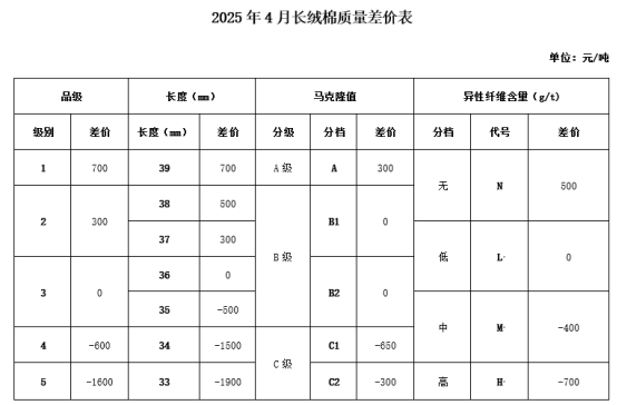 依據(jù)2025年3月的棉花公檢質(zhì)量數(shù)據(jù)、中國棉花協(xié)會(huì)質(zhì)量價(jià)差系統(tǒng)采集的加工企業(yè)銷售價(jià)和紡織企業(yè)到廠價(jià),以及當(dāng)月的中國棉花價(jià)格指數(shù),并征求業(yè)內(nèi)相關(guān)專家的意見,與上月相比2025年4月《鋸齒加工細(xì)絨棉質(zhì)量差價(jià)表》、《皮輥加工細(xì)絨棉質(zhì)量差價(jià)表》和《長絨棉質(zhì)量差價(jià)表》差價(jià)均保持不變。