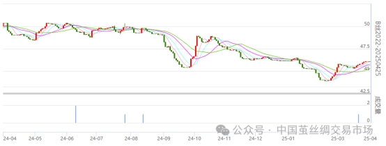 今日(2025年04月01日,周二)中國繭絲綢交易市場生絲電子指數(shù)微跌0.01%報收于4603.63點(diǎn)。B絲2022D(商檢4A級生絲):250425合約報平收于46.11萬元;250925合約下跌0.09萬元報收于46.02萬元;260325合約報平收于45.87萬元。