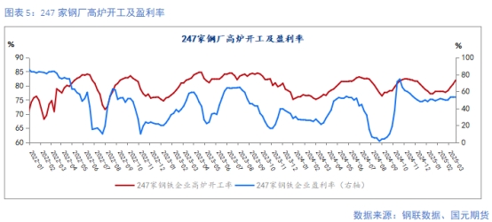 一季度,247家樣本鋼廠周均盈利率50.89%,環(huán)比下降5.22個(gè)百分點(diǎn),同比增加25.29個(gè)百分點(diǎn)。247家樣本鋼廠鐵水日均產(chǎn)量228.07萬噸/天,環(huán)比下降2.10%,同比增加2.61%。五大品種鋼材周均產(chǎn)量827.9萬噸,環(huán)比下降3.97%,年同比下降1.76%。五大品種鋼材庫存為1788.09萬噸,較上季度末上升678.72萬噸。統(tǒng)計(jì)局?jǐn)?shù)據(jù)顯示,1-2月粗鋼產(chǎn)量1.66億噸,同比下降0.99%。