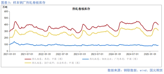 一季度,熱軋卷板樣本鋼廠周均開工率為82.09%,環(huán)比增加1.56個(gè)百分點(diǎn);熱軋卷板周均產(chǎn)量為319.71萬噸,環(huán)比增加10.33萬噸,增加幅度為3.34%。熱軋卷板周均表觀消費(fèi)為312.87萬噸,環(huán)比下降4萬噸,幅度為-1.26%。熱軋卷板庫存為395.96萬噸,環(huán)比增加89萬噸,幅度為28.98%;其中,廠內(nèi)庫存為85.14萬噸,環(huán)比增加6.22%。社會(huì)庫存為310.82萬噸,環(huán)比增加37.05%。