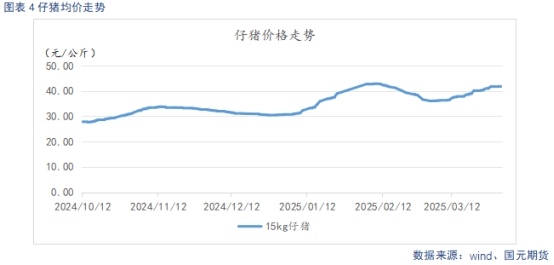 截止4月1日,仔豬出欄均價(jià)41.87元/公斤,較上周環(huán)比上漲1.24元/公斤。近期隨著氣溫轉(zhuǎn)暖,補(bǔ)欄積極性增加,市場交投轉(zhuǎn)好,價(jià)格經(jīng)歷節(jié)后回調(diào)后,再次上行。