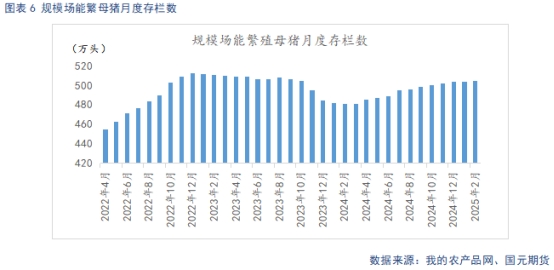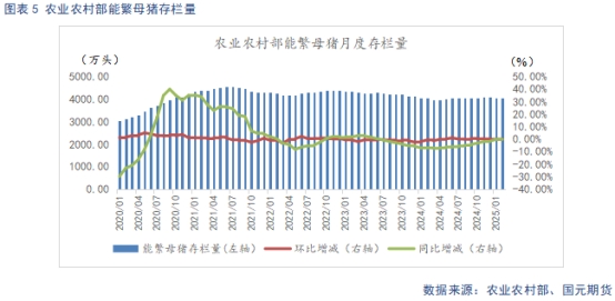根據(jù)農(nóng)業(yè)農(nóng)村部數(shù)據(jù)顯示,2025年2月末全國能繁母豬存欄量4066萬頭,同比上升0.6%,環(huán)比上升0.01%,在24年12月至25年1月,能繁母豬存欄短暫下調(diào)后,再度回升,供給增量形勢延續(xù)。根據(jù)農(nóng)業(yè)農(nóng)村部新修正的《生豬產(chǎn)能調(diào)控實(shí)施方案》,當(dāng)前能繁存欄相當(dāng)于正常保有量的104.6%,處于綠色偏高區(qū)域。
