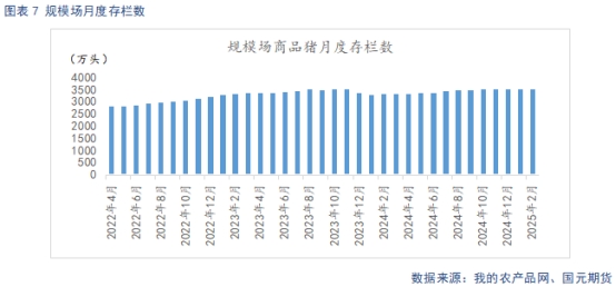 據(jù)Mysteel統(tǒng)計(jì),截止2025年2月底,規(guī)模場能繁母豬存欄量為504.46萬頭,環(huán)比上調(diào)0.05%,同比增長4.86%。進(jìn)入2月,疫病影響逐步減弱,加之養(yǎng)殖端仍有一定盈利空間,去產(chǎn)能意愿不強(qiáng),能繁母豬存欄小幅上調(diào)。自24年3月起,養(yǎng)殖利潤回暖支撐下,規(guī)模場產(chǎn)能逐步回升,從生產(chǎn)周期推算,2025年規(guī)模場理論產(chǎn)能呈現(xiàn)環(huán)比上升態(tài)勢。規(guī)模場2月商品豬存欄數(shù)為3535.02萬頭,環(huán)比增加0.51%,同比增加6.87%。規(guī)模場2月商品豬出欄量為885.01萬頭,環(huán)比下降14.04%,同比增加26.98%。2月出欄天數(shù)較少,加之春節(jié)后標(biāo)肥價(jià)差走擴(kuò),養(yǎng)殖端有一定壓欄操作,整體出欄量環(huán)比大幅下降。3月出欄天數(shù)大于2月,規(guī)模場出欄計(jì)劃增加,預(yù)計(jì)3月出欄量將環(huán)比增長。從生產(chǎn)周期推算,2025年一二季度,進(jìn)入產(chǎn)能增長兌現(xiàn)期,疊加前期壓欄、二育供給后置,供給面臨進(jìn)一步釋放壓力。