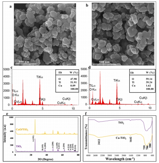 絲素蛋白納米顆粒(SFNPs)不僅穩(wěn)定性高、無(wú)毒,還能實(shí)現(xiàn)藥物的可控釋放。阿霉素 “搭乘” SFNPs 這趟 “列車”,被精準(zhǔn)輸送到腫瘤組織。經(jīng)檢測(cè),制備的 DOXSFNPs 粒徑為257±6nm,zeta電位為 -14.3±1.8mV,載藥率高達(dá) 12.38±1.73%。此外,TNPs和CTNPs的EDAX結(jié)果表明,在二氧化鈦結(jié)構(gòu)中加入氧化銅后,Cu重量百分比增加到1.62 %,表明CT納米顆粒的合成成功。XRD 表明合成的TiO?以銳鈦礦相為主并含少量金紅石相,CTNPs 出現(xiàn)與CuO衍射峰 ;FTIR 分析了其化學(xué)組成但CuO在特定區(qū)域特征峰不明顯;用 DCFH - DA 檢測(cè)發(fā)現(xiàn) CTNPs 產(chǎn)生的 ROS 顯著多于 TNPs,因其能增強(qiáng)電子 - 空穴對(duì)分離等提升 ROS 產(chǎn)量,后續(xù)將基于 CTNPs 研究聲動(dòng)力療法對(duì)水凝膠抗腫瘤特性的影響。(圖1)