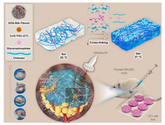 該研究旨在開(kāi)發(fā)一種基于多糖的具有適當(dāng)物理和化學(xué)性質(zhì)的生物活性水凝膠,用于在乳腺癌治療中結(jié)合化療和 SDT。特別研究了負(fù)載 DOX 的 SF - NPs(DOXSF/CS)的 CS 水凝膠對(duì)化療藥物的控釋潛力。因此,該研究首先將 DOX 負(fù)載到 SFNPs 中,然后將 DOX - SFNPs 和 CuO - TiO?納米顆粒(CTNPs)分散在 CS 水凝膠基質(zhì)(CT - DOXSF/CS)中,以制備具有合適生物學(xué)和機(jī)械性能的所需水凝膠。對(duì)制備的水凝膠的化學(xué)結(jié)構(gòu)、溶脹率、降解率、機(jī)械和流變學(xué)性能以及細(xì)胞相容性進(jìn)行了全面研究。該研究在體外和體內(nèi)評(píng)估了這些水凝膠的抗癌效果。(Scheme 1)