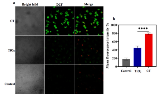 為探究 TNPs 和 CTNPs 產(chǎn)生 ROS 的水平差異及其在癌癥治療中的應(yīng)用,利用 DCFH-DA 作為探針檢測(cè) MCF-7 細(xì)胞系中的 ROS 水平,通過(guò) CLSM 和 ELISA 對(duì)產(chǎn)生的熒光進(jìn)行定量分析,結(jié)果顯示 CTNPs 產(chǎn)生的 ROS 顯著多于 TNPs。這是因?yàn)樵赥iO2中引入 CuO 后能產(chǎn)生新電子態(tài),增強(qiáng)電子-空穴對(duì)分離,同時(shí) CuO 作為助催化劑可促進(jìn)電子轉(zhuǎn)移、防止復(fù)合,其催化特性還能加強(qiáng)與氧和水分子的作用,并且銅參與的類芬頓反應(yīng)也有助于產(chǎn)生更多 ROS。基于此,后續(xù)將利用 CTNPs 深入研究聲動(dòng)力療法對(duì)水凝膠抗腫瘤特性的影響。(圖2)