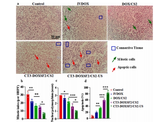 通過(guò)染色觀察腫瘤的有絲分裂指數(shù)、核多形性和細(xì)胞凋亡水平,發(fā)現(xiàn)對(duì)照組的 MI 和 NP 值最高,細(xì)胞生長(zhǎng)分裂活躍。DOX/CS2 組凋亡面積小于其他組,但相比對(duì)照組仍有顯著差異且 MI 較低。CT3 - DOXSF2/CS2 組因 SF 持續(xù)釋藥,在注射部位周邊腫瘤區(qū)域誘導(dǎo)出更多凋亡;DOX/CS2 組因藥物被鄰近組織快速吸收,局部療效受限,凋亡面積小。CT3 - DOXSF2/CS2 - US 組凋亡水平更高,體現(xiàn)了 CT 聲動(dòng)力療法與 DOX 控釋的協(xié)同促凋亡作用。經(jīng) SDT 后,CT 納米顆粒產(chǎn)生的 ROS 會(huì)損傷細(xì)胞成分、激活信號(hào)通路,促使細(xì)胞凋亡并增加對(duì) DOX 的敏感性??傮w上,CT3-DOXSF2/CS2 和CT3-DOXSF2/CS2 - US 組在高凋亡水平下,MI 和 NP 值低于 IVDOX 組 。
