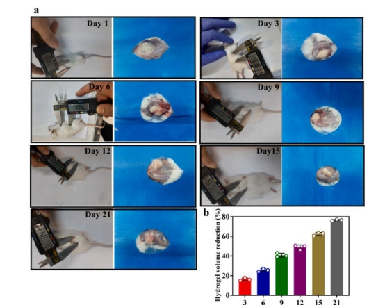 研究人員將水凝膠皮下注射到小鼠背部,用卡尺測(cè)量體積并通過(guò)手術(shù)直接觀察其在1 - 21天內(nèi)的變化,發(fā)現(xiàn)水凝膠呈透明狀且隨時(shí)間逐漸變小,這是由于 CS 聚合物釋放導(dǎo)致降解。測(cè)量水凝膠重量發(fā)現(xiàn),注射 12、15、21 天后,其重量損失分別約為 43.51%、56.76%、75.94% 。對(duì)水凝膠周圍組織進(jìn)行組織學(xué)分析,雖在注射后第 6 天出現(xiàn)急性炎癥,但從第 9 天開(kāi)始炎癥明顯減輕,到第 21 天基本消失,證明該水凝膠生物相容性良好。